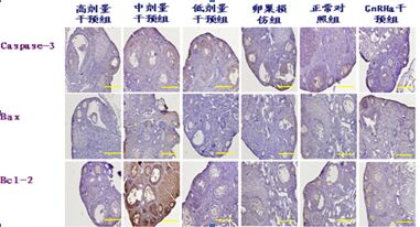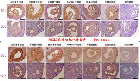 但妇科养荣胶囊治疗不孕症的机理何在呢?为了回答这个问题,这项研究观察了受试动物卵巢细胞的变化,发现经过高浓度妇科养荣胶囊治疗8周后窦卵泡、窦前卵泡均已恢复至正常水平(与正常对照组无显著差异)。而对AMH、FOXL2的观察,则说明妇科养荣胶囊能明显改善受试动物的卵巢储备功能和对卵泡生长、成熟过程的调控(与卵巢损伤组有显著性差异)。就目前研究的结果看,妇科养荣胶囊治疗不孕症的机理,可能与改善卵泡发育微环境,保护卵泡发育中起关键作用的颗粒细胞,提高卵巢储备功能有关。